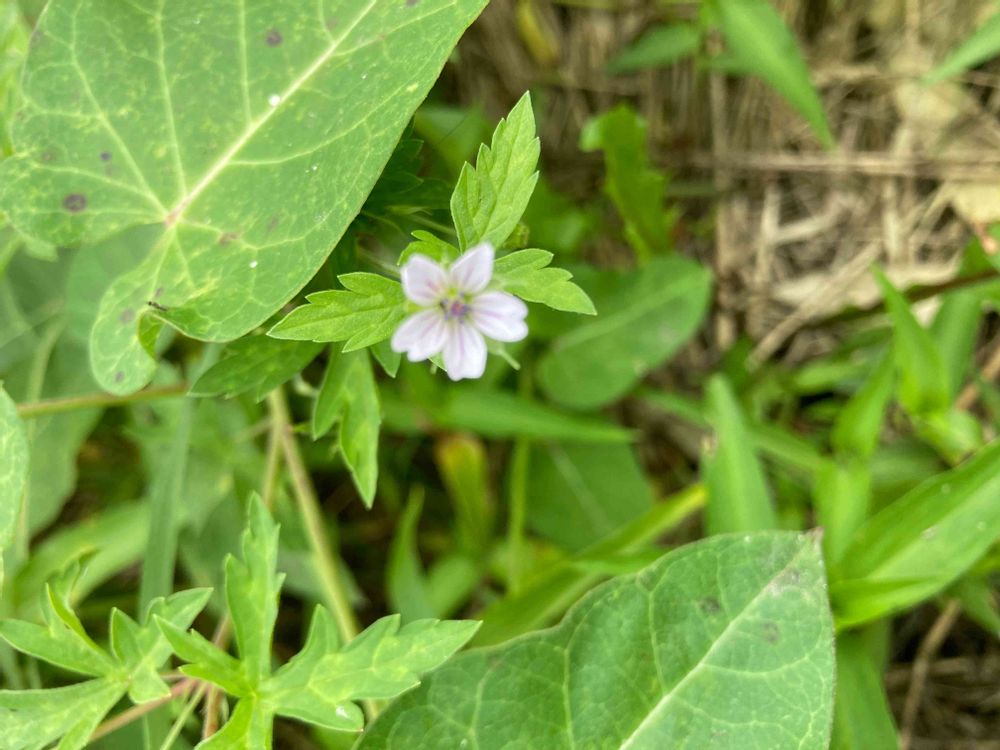 花の直径は5ミリ程度程度でした。イチゲフウロかゲンノショウコウか極似です。端の写真で葉がミツバでない事が判明し、イチゲフウロと判明しました。「一華風露」
