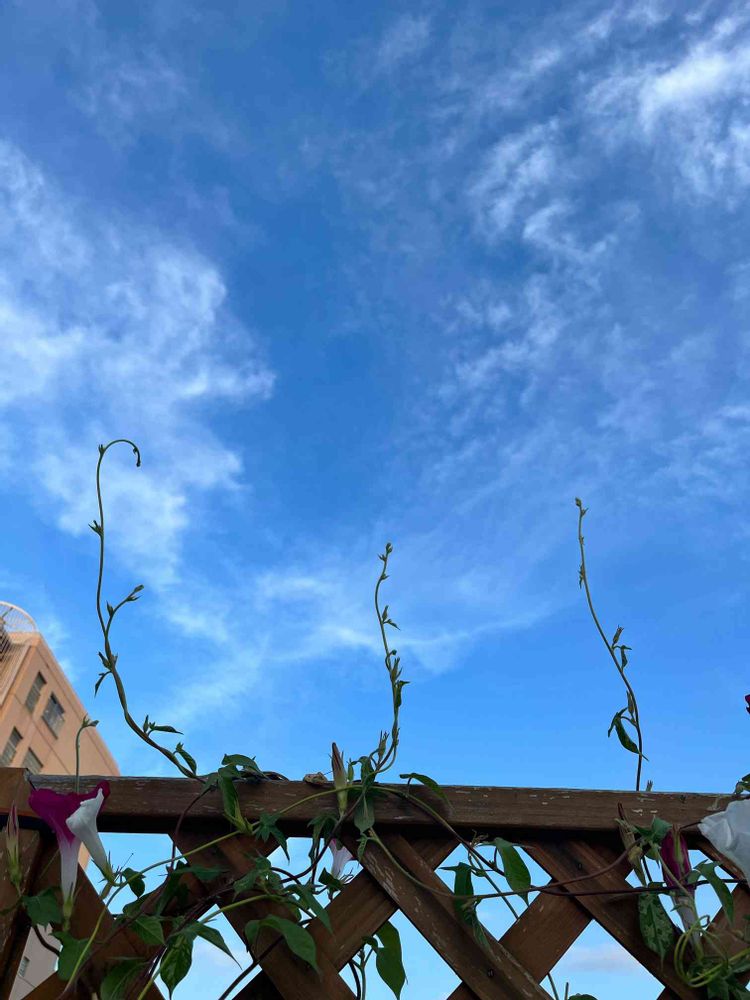 朝顔がぐんぐん伸びて、柵の外へ😅