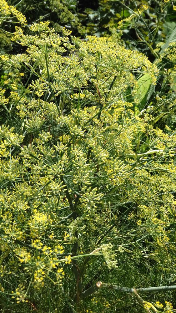 このpicでは フェンネルの黄色い花は ほぼ終わり 楕円形の薄緑の実が付いていますが 秋には茶色に熟します。
