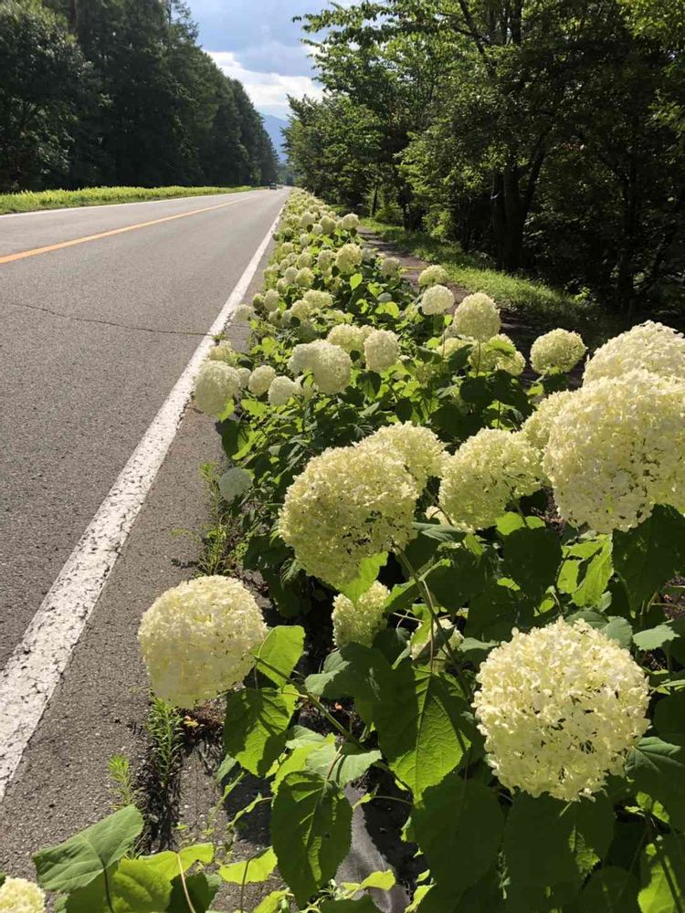 長野県八ヶ岳原村ペンションビレッジの長い坂道に真っ白なアナベルロード街道 1キロに渡って咲いています。