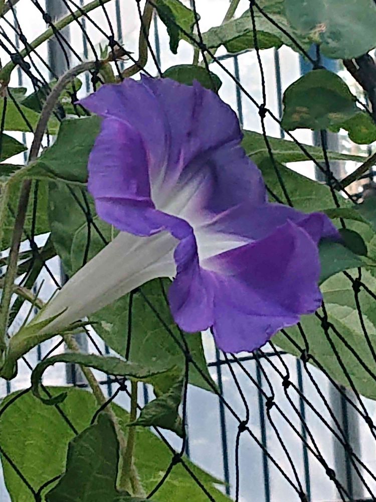 さん。こんにちは。そうそう。そうなんです。上へ上へジャックと豆の木みたいに伸びて、やっと咲いたはいいけど、上を見上げて撮るしかない。😢ミーシーさんみたいに、冒険はようせんので。これって、朝顔あるある?ミーシーさん、くれぐれもお気をつけて。上向いて撮ったのも投稿してるので良かったら、見て下さいね。上向いて撮った時いっしょに写っているガラス玉は養殖のブイです。飾りにしています。