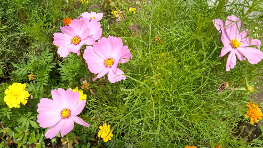 こんばんは。コスモスの醸し出す繊細な美しさに、暫し見惚れてしまいました。マリーゴールドの黄色やオレンジ色が、コスモスの細いピンク色のお花にアクセントを付けていてとても綺麗ですね。有難う御座いました。