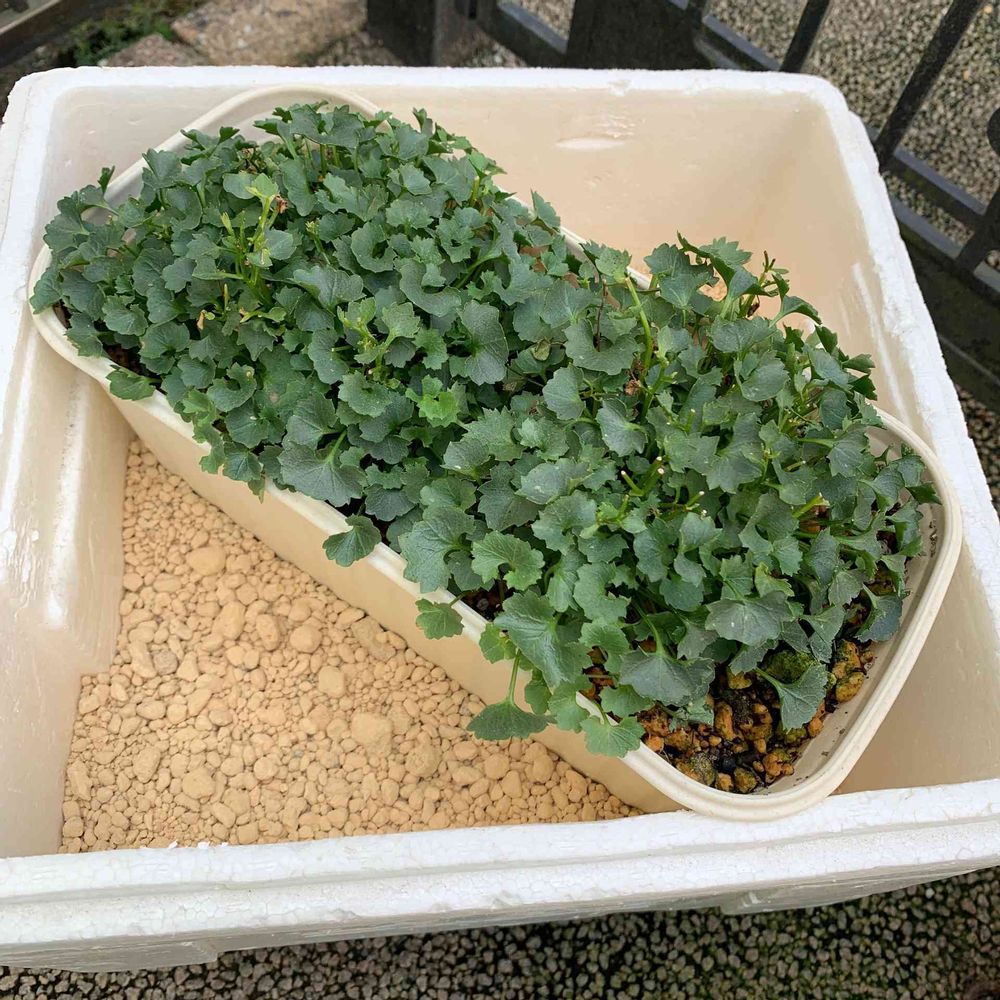 捨てようと思っていた発泡スチロールの底に穴を開け、底石と鹿沼土をひきました。鉢が入らず、斜めで無理やり💦見た目はこの際、度外視です。発泡スチロールの下には水が抜けるように台をかましてます。