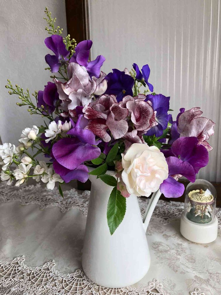 スイートピーは、ムラサキと、紫に白が乗っかってるような微妙な色との2種類です。後ビオラも入れてみました😊💕