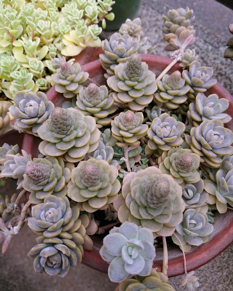 この子持ち蓮華は、去年夏前に買って、真夏に90%くらい溶けて瀕死状態→残った4つくらいの子で越冬→春から俄然元気復活、どんどん厚みをます→たくましく成長(正直あまり可愛いくない)→花芽も盛り上がってきて、いったいこの子は何を目指し、どこに向かっていくのか、最初の姿からはもはや別人…………。
