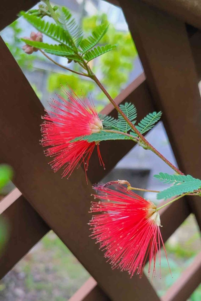 ウッドデッキの鉢植えヒネム(緋合歓)。