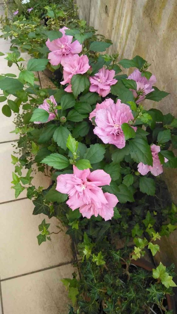 名前教えて下さい。 八重咲きむくげ有難うございます。友人の庭のお花です。