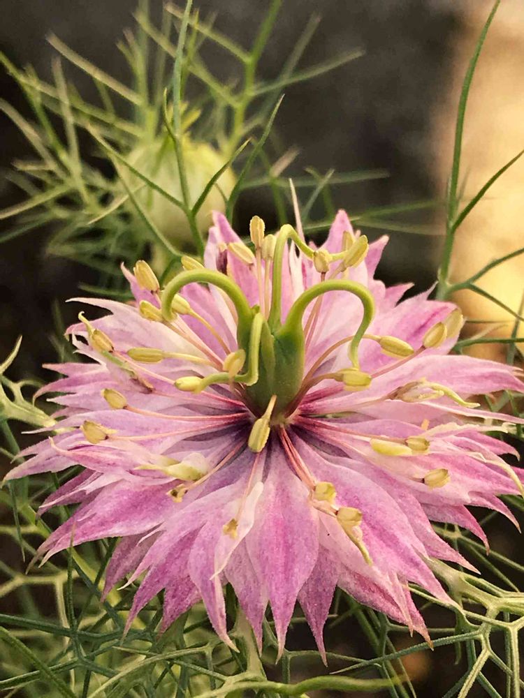 ニゲラ(クロタネソウ)春のこぼれ種から開花。昨日、白のニゲラだと思い投稿!その後夕方にピンク色に変化。ピンクのニゲラでした。たった数時間で色変化。猛暑のせい?いや私の早とちり!?