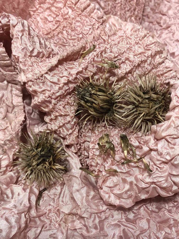 釣り針状の返しのついた種が、草取り中に服に取りついて居ます。