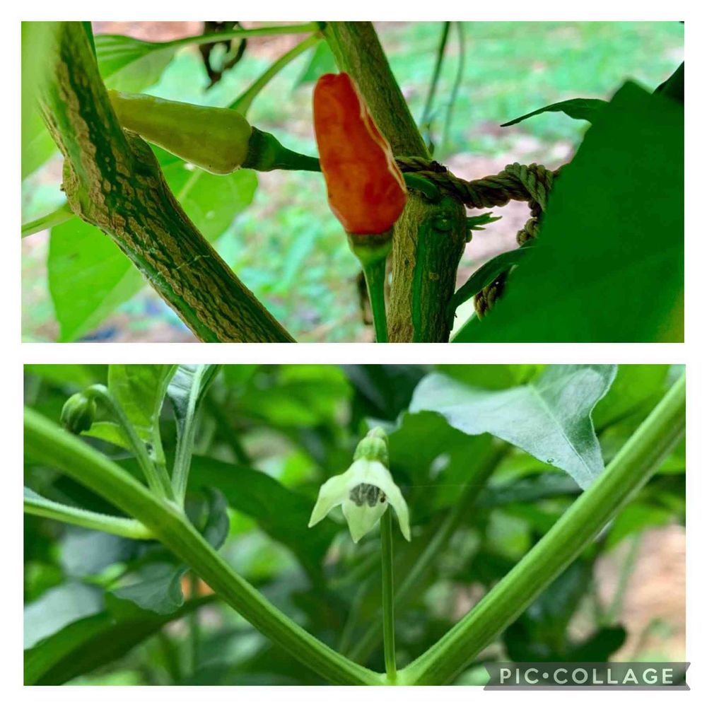 島唐辛子🌶が赤くなってきました〜😄第一弾の実が付いてきて、追い肥したのが悪く、花芽が一旦止まりましたが、第二弾の花が咲いてきました〜😄やれやれです😅