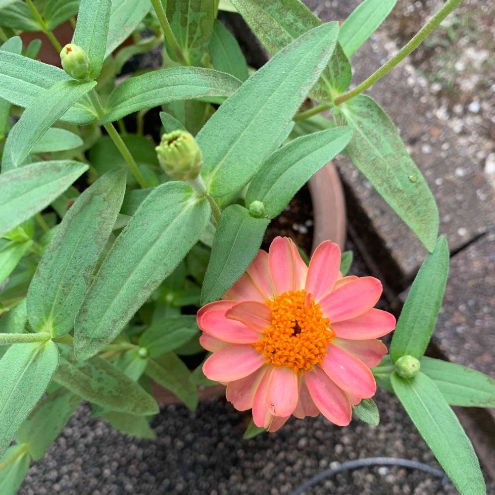 おはようございます。7/20ぶりに投稿のジニアです。買った時はオレンジ寄りでしたが、新しい蕾はピンク寄りで開花🌸蛍光色にも見える時があります😊
