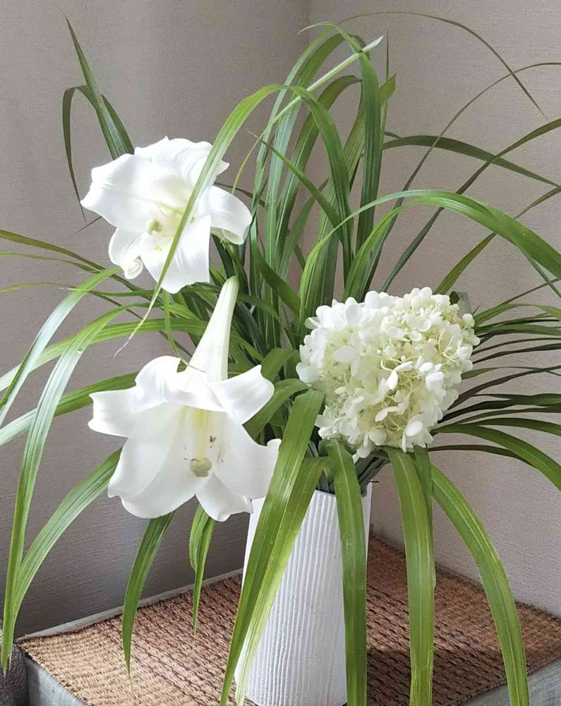 おはようございます😃 白い器に形の違う2種の白い花、それに緑の細い葉 素敵な組み合わせが涼を感じさせてくれました!ありがとう😊