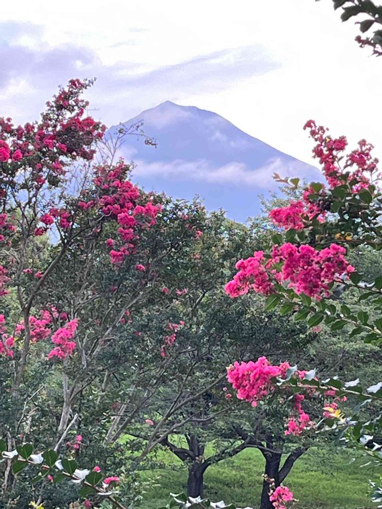 夏を彩る百日紅の華やぎと、凛としてそびえる富士山🗻