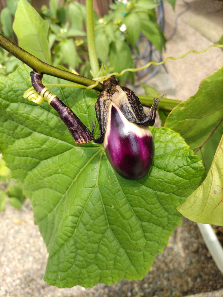 さん 暑いのでなすがやけそうになるので葉っぱの下に待機してもらっていました(笑)