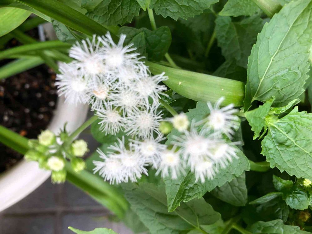 花期は夏から秋で、白いふわふわっとしたアゲラタムのような花を立ち上げ開花します。