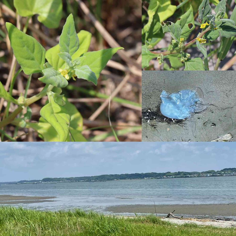 干潮だったようで、浜辺のあちこちに海藻や🐚🐚が沢山打ち上げられでいましたが、中でも遠目で見ても綺麗な水色のビニール袋のような物があちこちに…