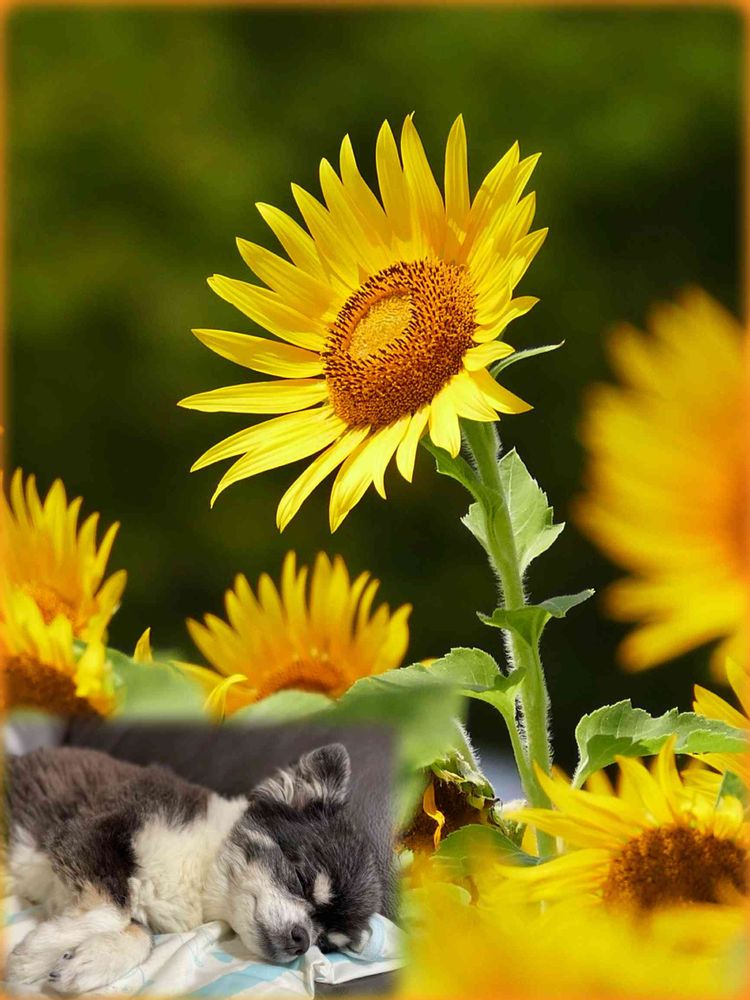 向日葵🌻に囲まれて気持ちよさそうに寝る姿は可愛い💕🐶