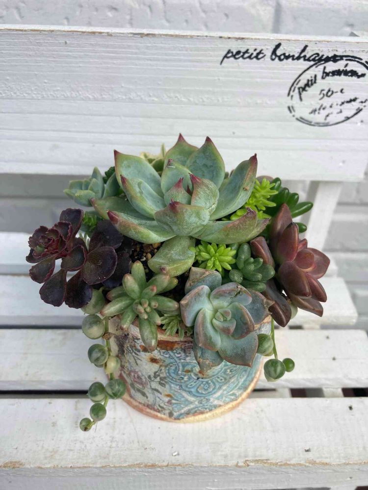 最初に、寄せ植え教室でこの缶と寄せ植えを作った時はネルソルを使ったのですが、どうも根付きが悪かったので、ネルソルなしで作り直した二代目が壊れてしまったのですが…