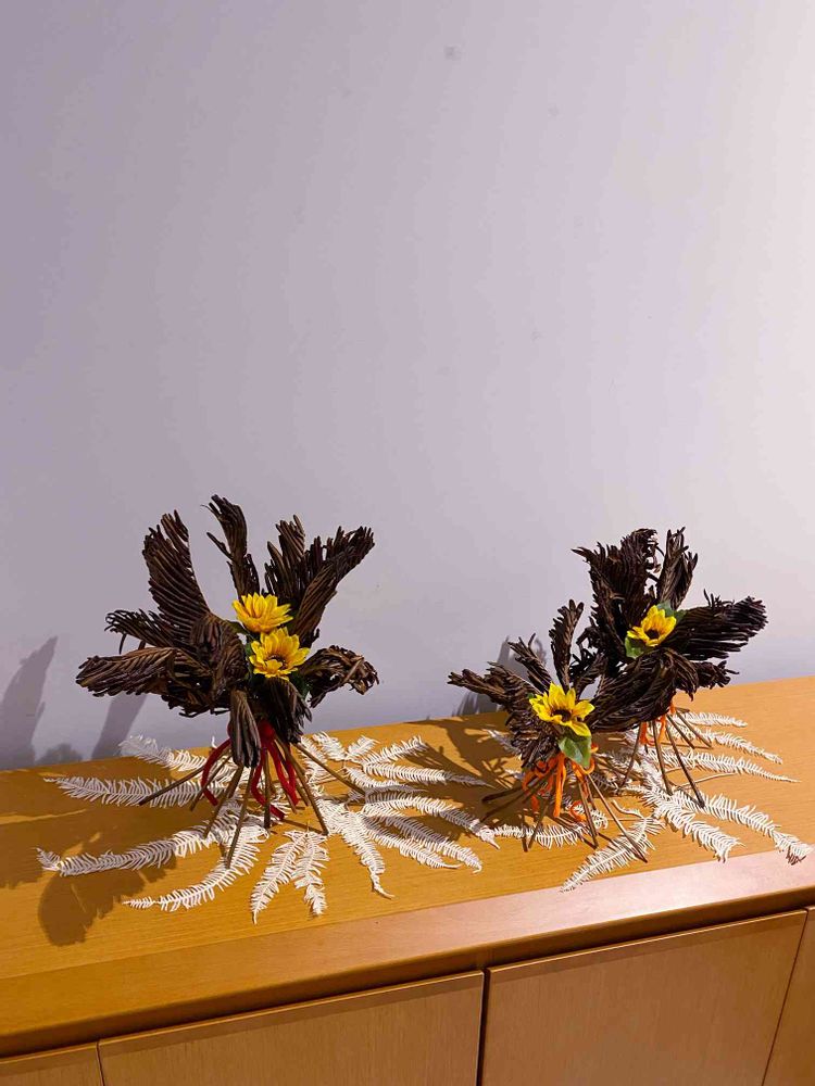 下の敷物を色々迷ったのですが、上の花材の関連性と色彩的・透け感的に、脱色ヤマシダに決めました。どうでしょう???