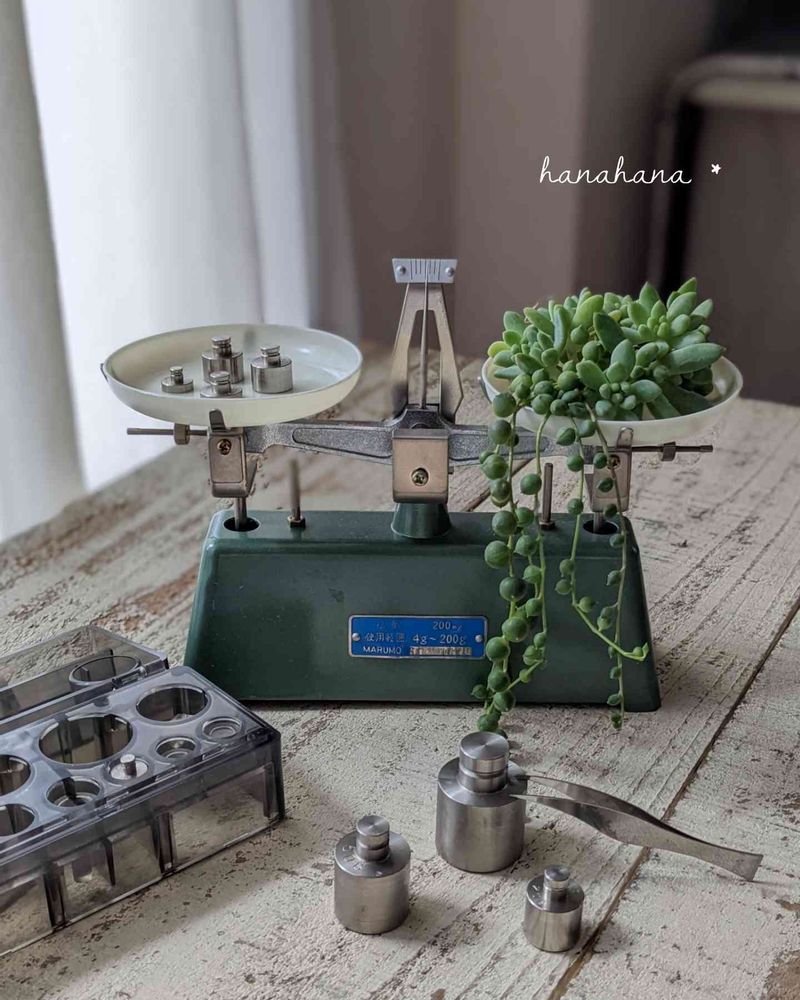 古道具の秤に多肉とグリネがピッタリで、私もお気に入りの一枚です✨
