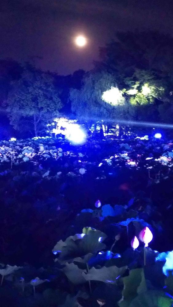 万博公園の日本庭園にて満月の下、蓮池のイルミナイトです。🏙️🌌🌺🌿😊😄🤗✌️