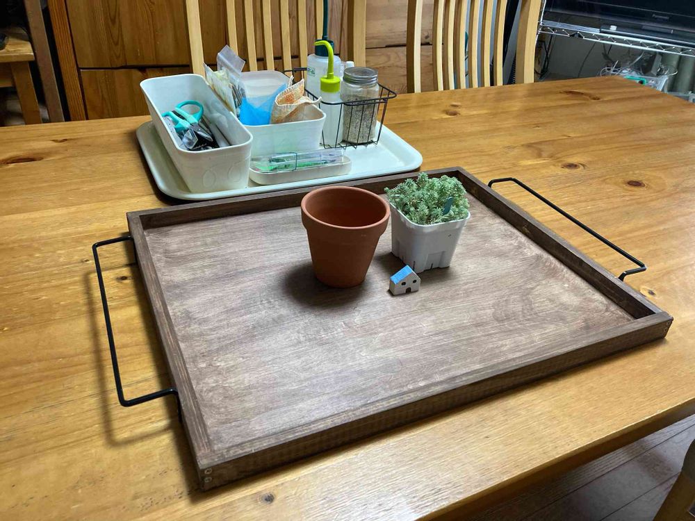 今まではお世話セットのトレイを使ってたのですが、面積が広くなって縁もある(土がこぼれにくい)ので植え替えがやりやすそうです。