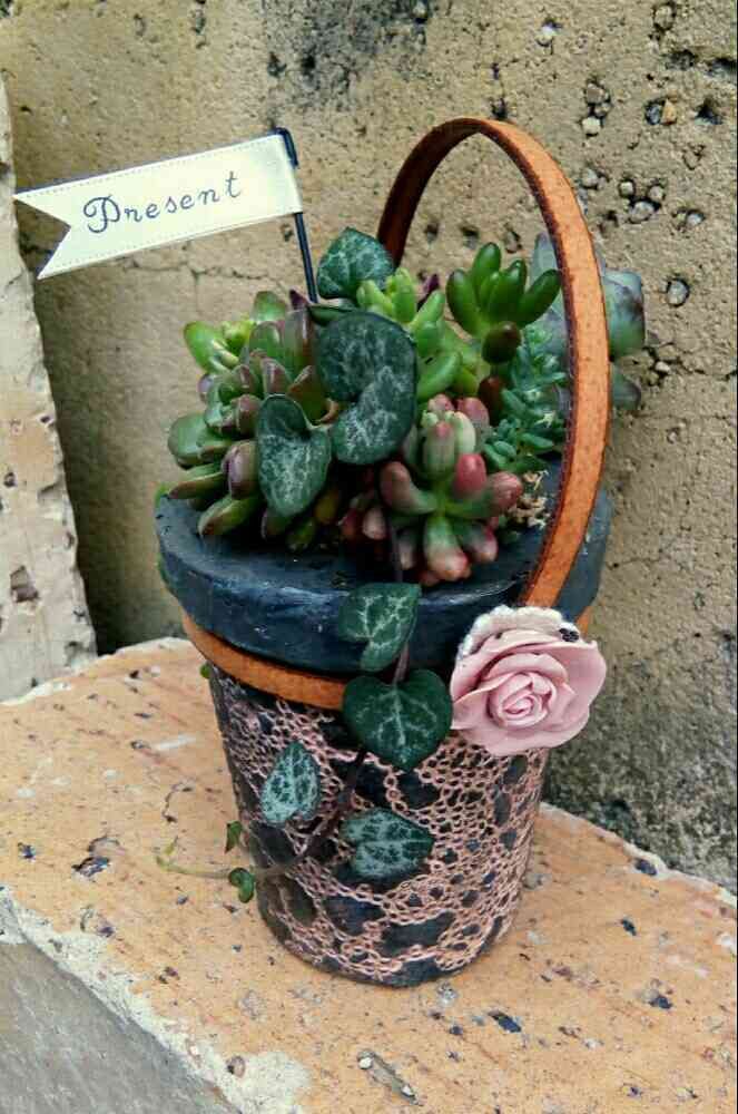 今回は、紙コップで型取りした、レース模様のモルタル鉢を造形、塗装して、それに多肉ちゃんを寄せ植え💖