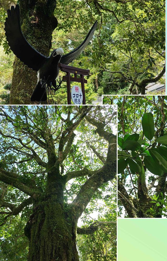 八咫烏(よく見るといますよ)と多羅葉の木、多羅葉の葉っぱを載せておきます。