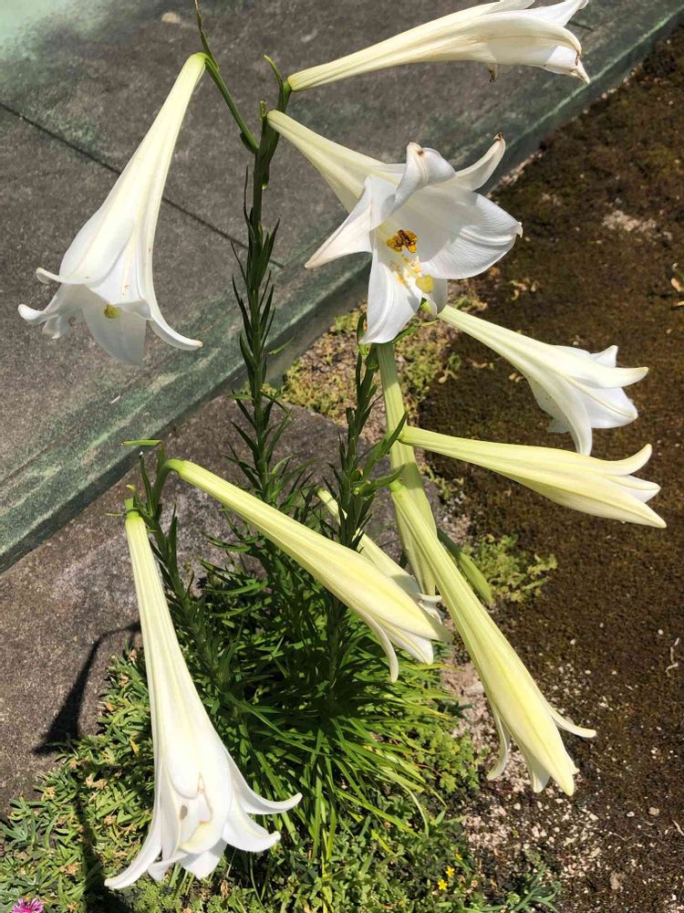 偶然の不思議なんですが 花が大好きだったおばあちゃん(義母)が亡くなった年から庭に咲き始めた高砂百合 14年目今年も今日満開で迎え盆❣️赤紫ラインも無くなり真っ白です