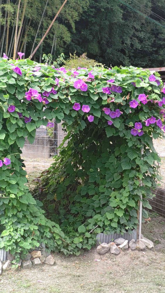 『獣害防止柵を利用して縦横2㍍、奥行き3㍍ほどのアサガオ用の棚を作り、つるをはわせている。棚の柱の補強に、斜めにつっかえ棒を取り付けたところ、そこを伝うつるがハート型のとがった部分を描いたようになった。「もともとハート型を狙ったわけではないんです」と笑う』(丹波新聞)
