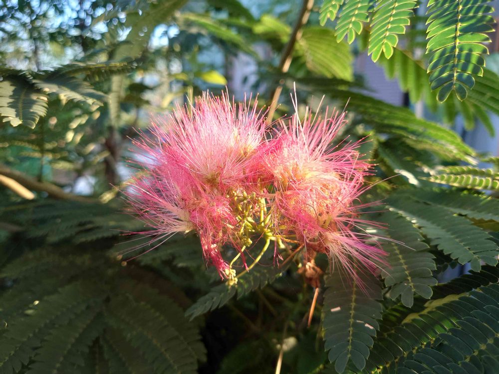 合歓の花は、ちょっとハゲハゲしたひな鳥の頭みたいですが、夏前に庭木を整理しようと枝をバッサリ切られたのに、それでも一生懸命に咲いている姿が健気で可愛いくて📷撮りました😄