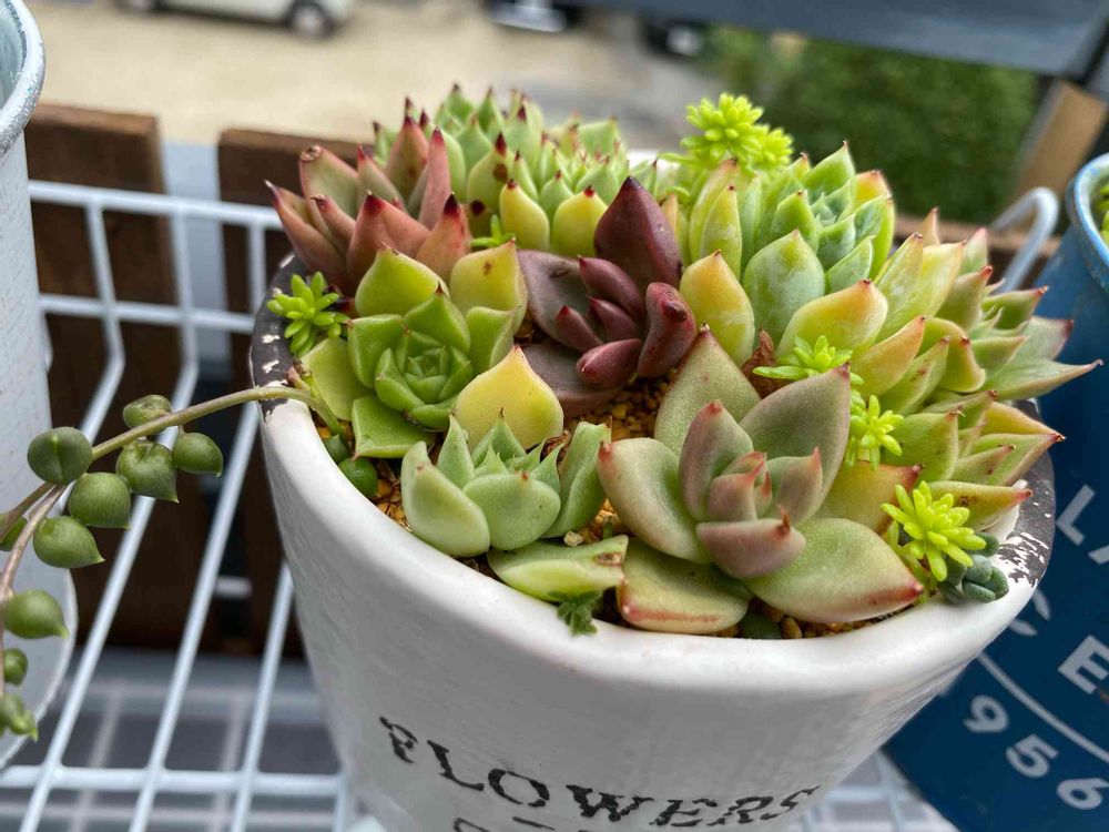 色々な多肉さんがぎゅぎゅっと詰まっていて可愛らしい寄せ植えですね♡素敵♡