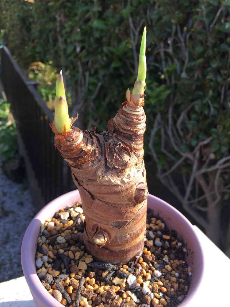 冬に葉が枯れたクワズイモ。新しい葉がでてきました。