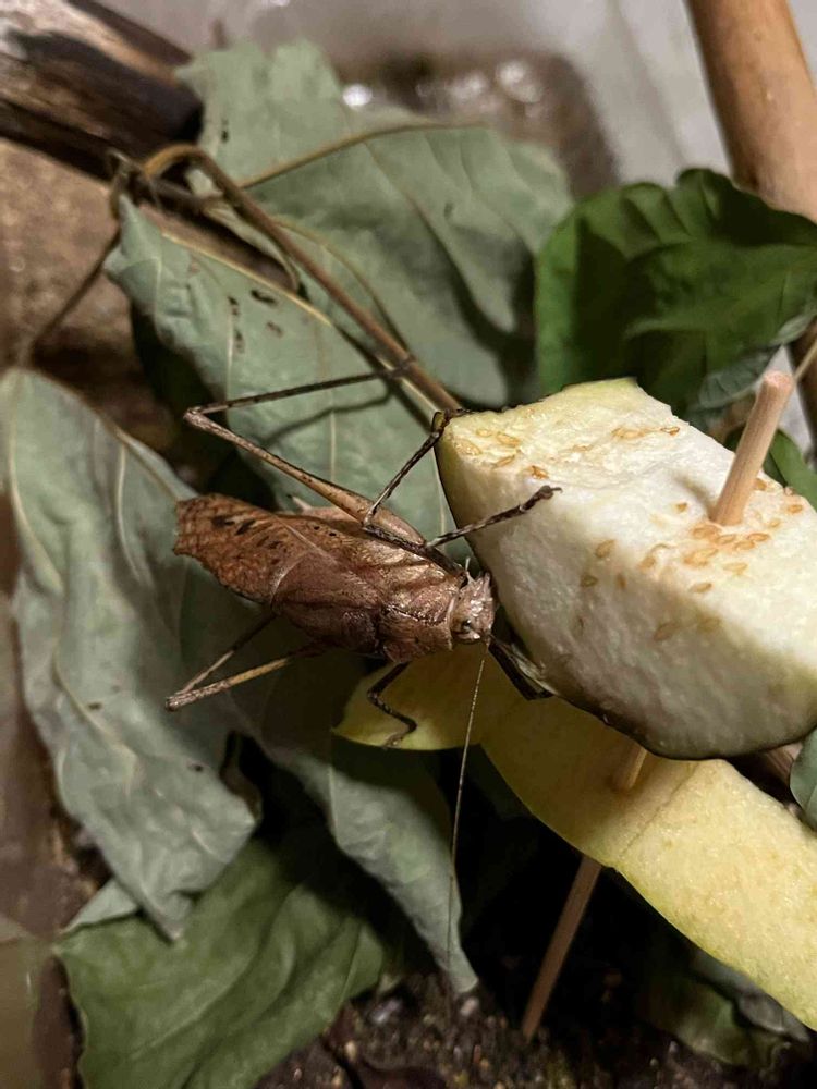 我が家で産まれたクツワムシ。茄子🍆を食べています(*☻-☻*)