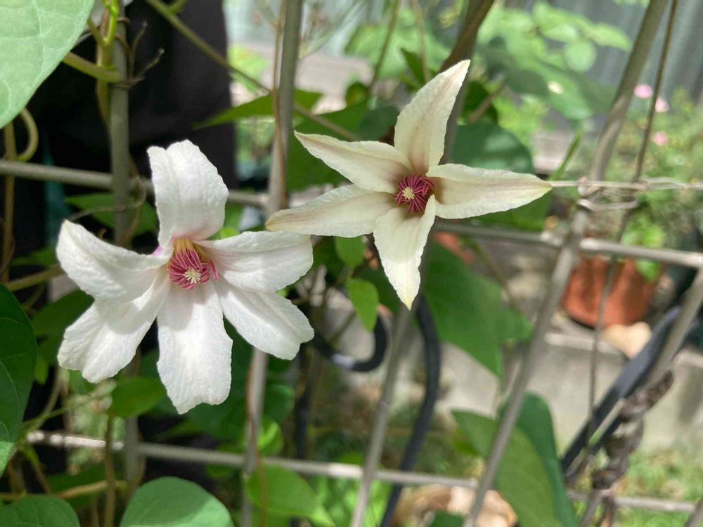 6月半ばに地際から2節ほどに短くカットしておいた新枝咲きのクレマチス、プリンセスケイトがつるを伸ばし2ヶ月して2番花をちらほら咲かせています。