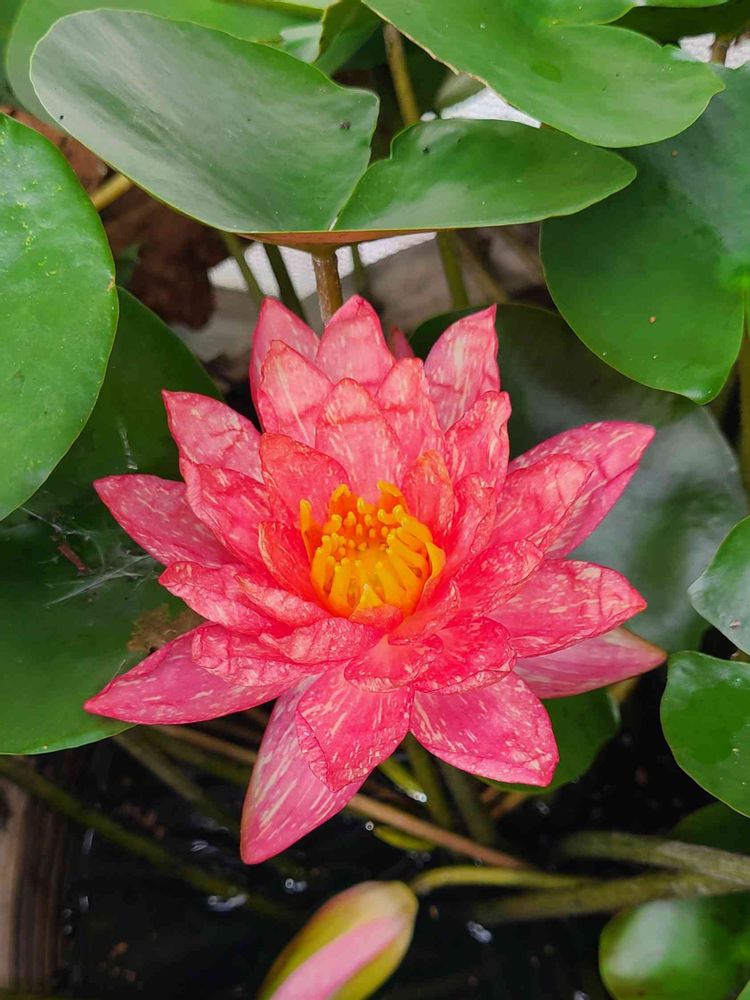 台風の日の朝、メダカに餌をあげていると、何やらピンク色が見えたので、睡蓮の葉っぱをどかしてみたら、何と、葉っぱの下にワンビサの花が咲いているではないか‼️