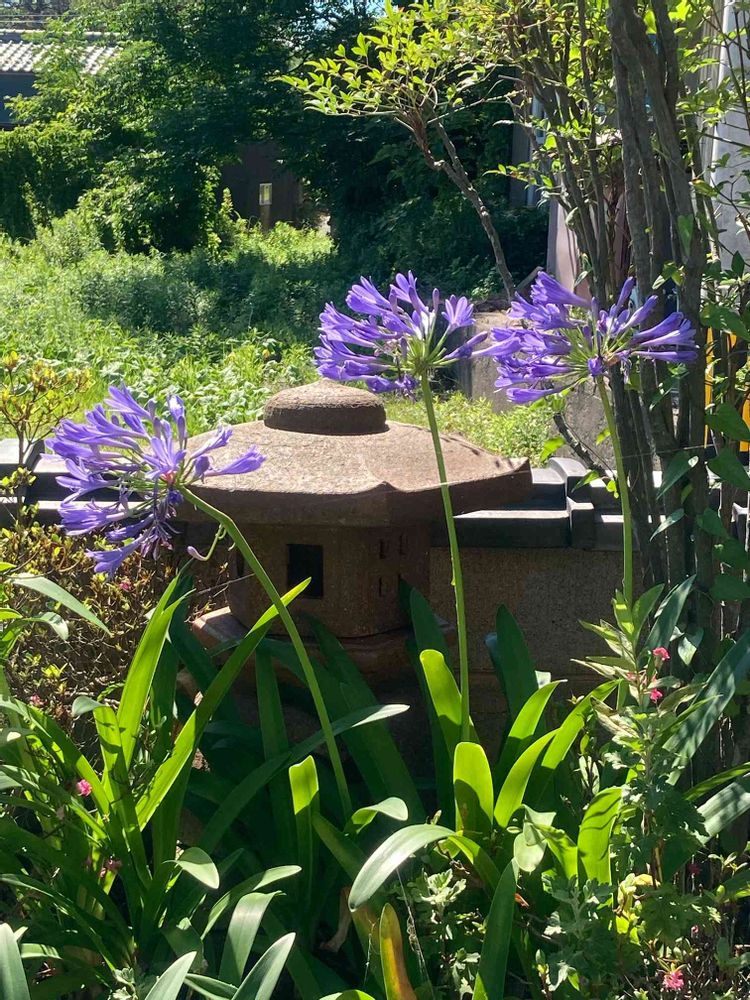 石灯籠には真っ赤な彼岸花のほうが似合いそうですが、うちは紫のアガパンサス😊