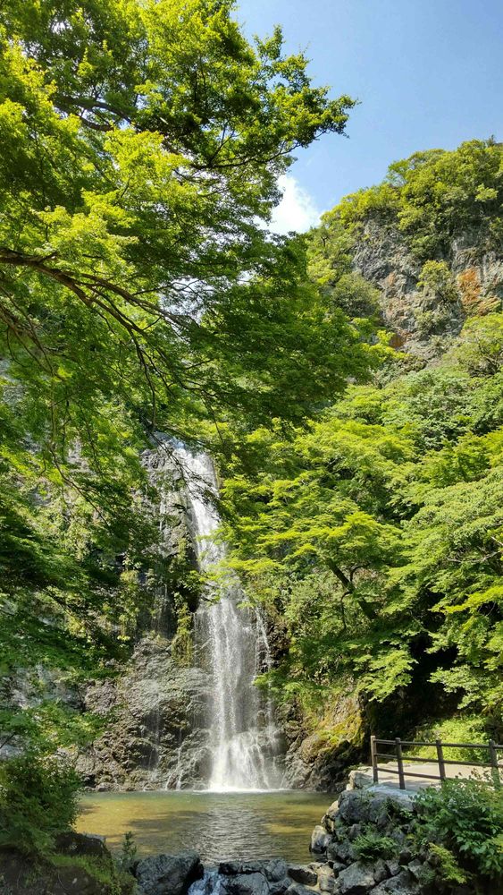 美しいマイナスイオンを放つ滝と緑と岩のある風景。抜ける空の青さも素敵✨