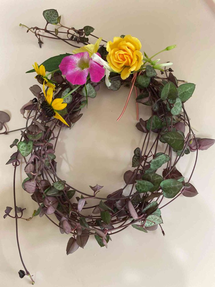 GSの方でやっていたのでハートカズラが伸びたらやってみたいなぁと、ちょっと傷んだ所があったので切ってみたら 小さなリースができ庭の花🌸を飾ってみました🤗