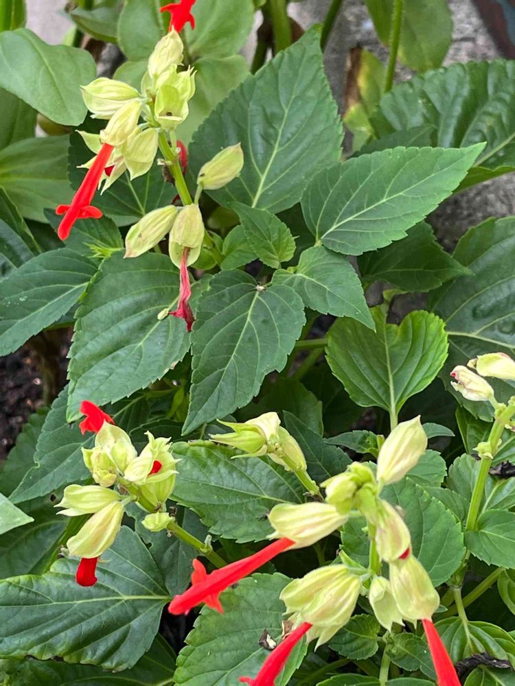 サルビアトーチライト❤️🤍真っ赤なサルビアとか真夏の花の印象ですが💔我が家のサルビア達は日向に置いていたら苞(ほう)が日に焼けて傷んでしまったので🥺日陰に避難中です💦💦