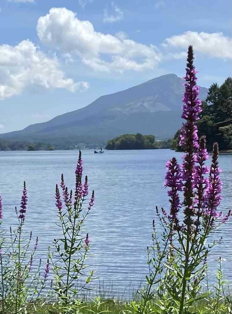 優雅な磐梯山と湖とミソハギの組み合わせがとても素敵です❣️😊