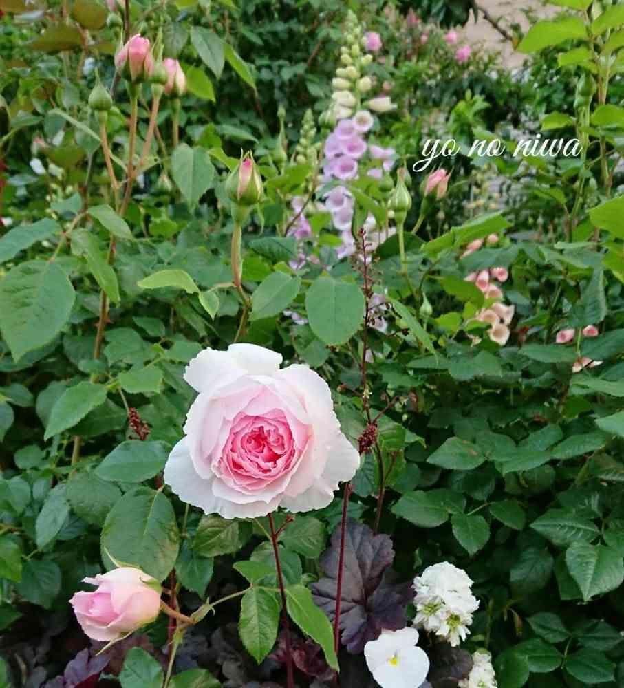 バラのピンクに、ヒューケラの濃い色がまた良いです✨