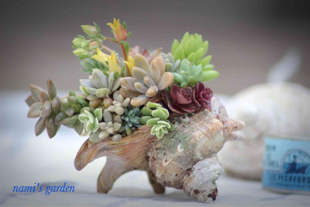お~✨サザエに寄せ植え~凄い発想✨ 何だかヤドカリちゃんがいいオウチが有ったぞと入ってルンルン気分で浜辺を歩いてるように見えます~🎶ダイジョブ✨見ていると、🚢🌊⚓️の香り気のせいかwww伝わってきます
