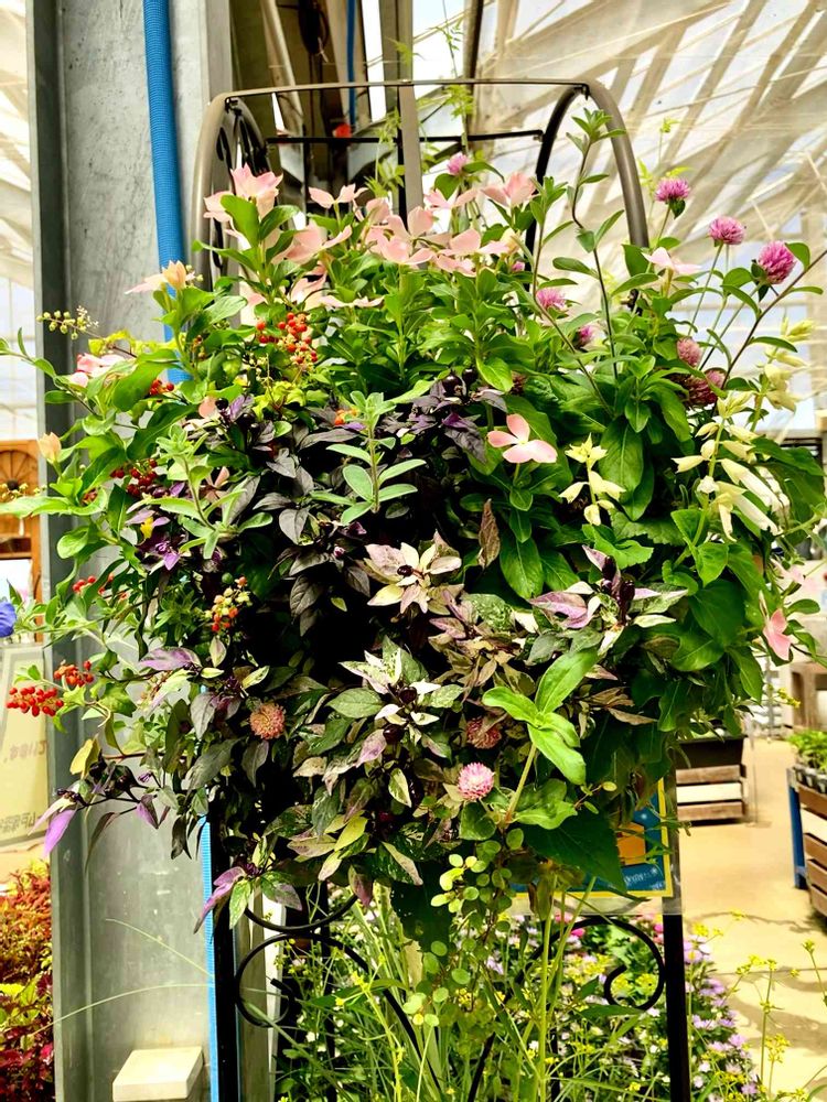 このハンギングは半円形のスリット鉢に約15ポットの植物が植えてあります。こちらの園芸店のスタッフさんが制作したのが沢山飾ってありホントどれも素敵なんですよ。😊🌿