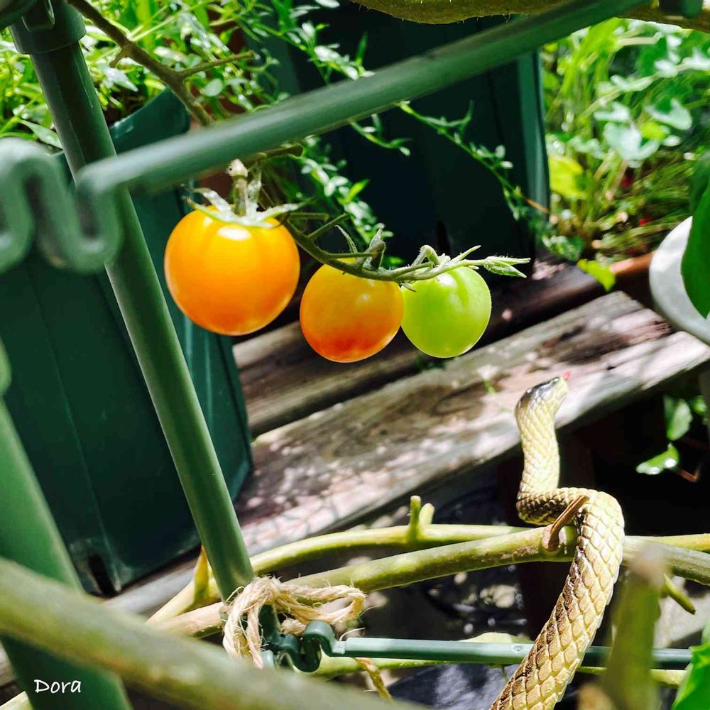 ミニトマトの守護神(100均のヘビのおもちゃ🐍)