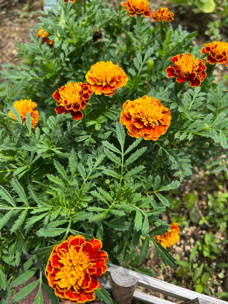 5月に小さな花が一輪ひっそりと咲いていたマリーゴールド。こんなに増えました。