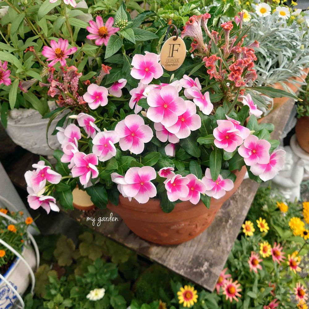 4日に植え付けたばかりの寄せ植えの日々草が花つき抜群で日に日に成長してくれてます❣️