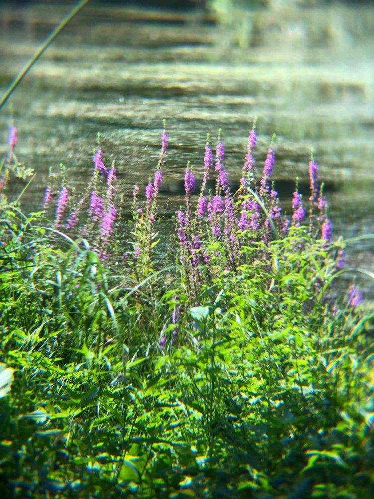 陽の光を受け、水面の様子とミソハギの縦線や色合いがとても素敵です💚💜✨
