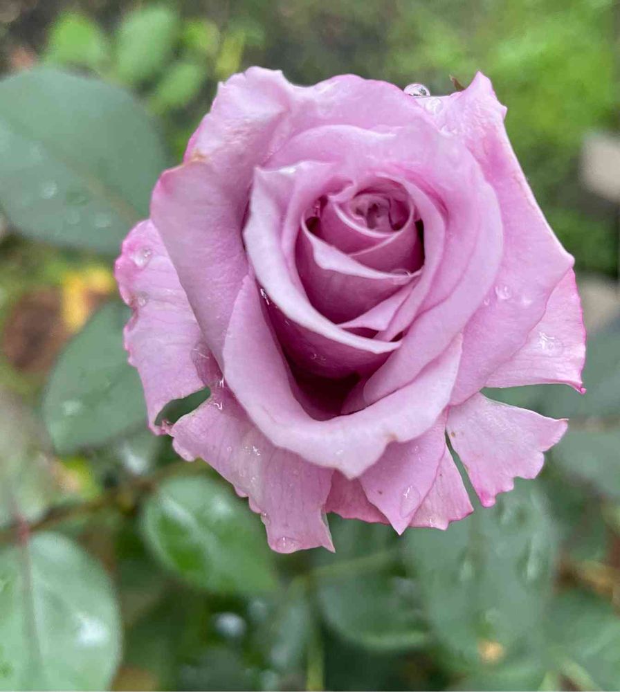おはようございます😃。今朝のバラは、シャルル・ド・ゴールの三番花さんです。昨夜の雨で雫が残ってますが、最後に頑張って咲いてくれてますよ〜