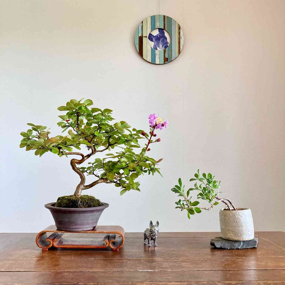 連日の暑さの中、サルスベリ(樹高22cm)が咲き始めました。右は多肉植物のプレクトランサスペンテリー(甘いミントの香りがします)です。